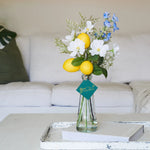 Amalfi : Vibrant lemons with real touch cosmo’s, larkspur and limonium set in artificial water in a glass vase.