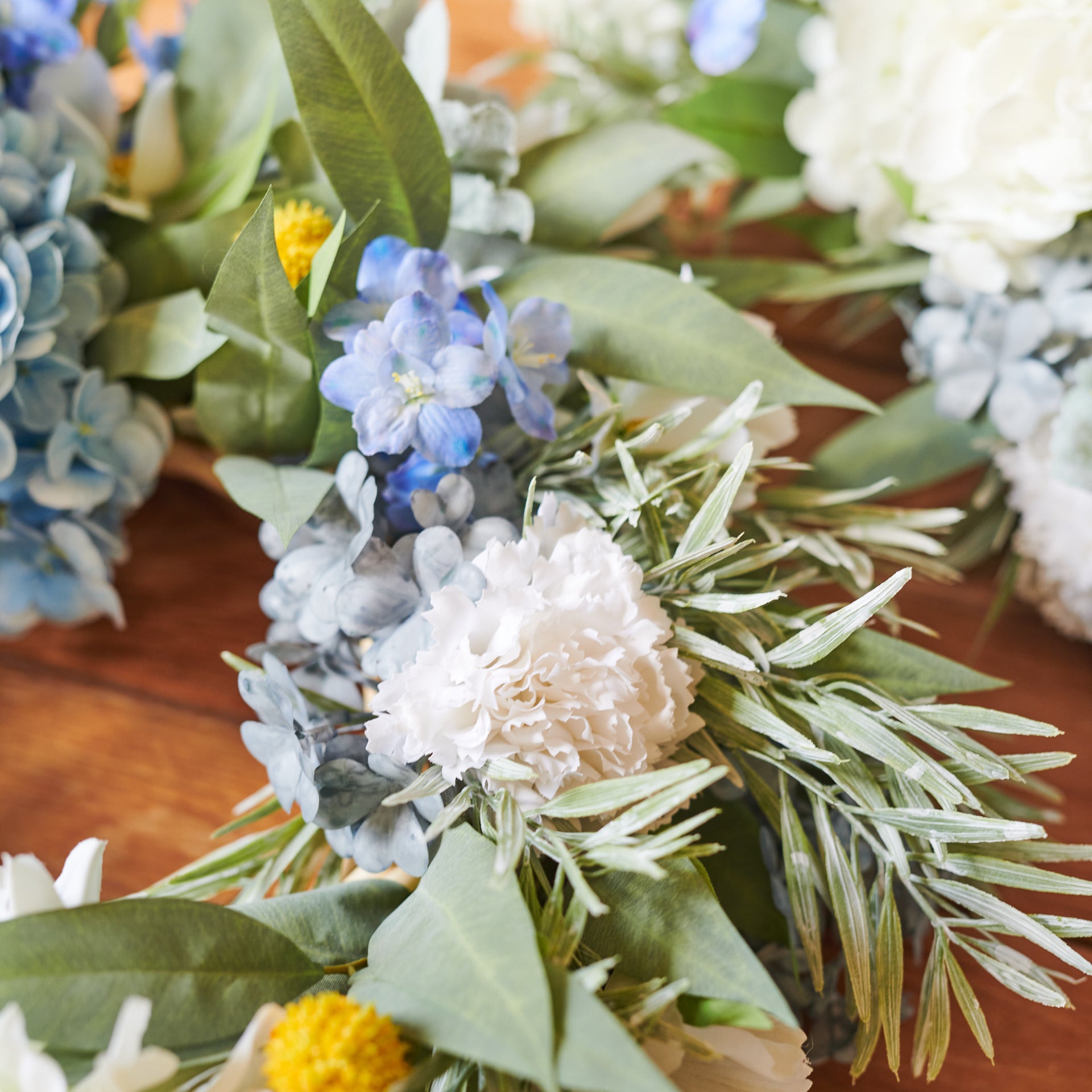 Azure : Handmade Table Garland of Hydrangea, Dahlias, Carnations and Larkspur with Cosmos, Dusty Miller and Billy Buttons.
