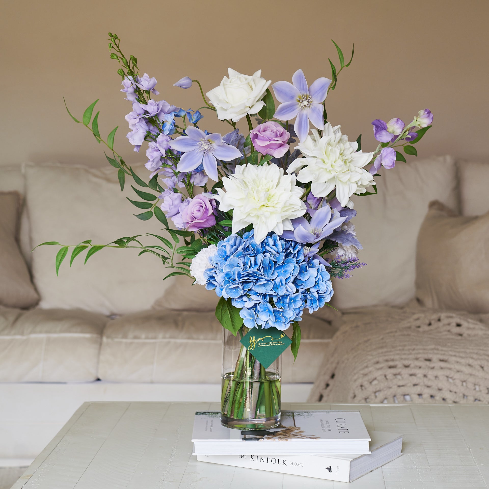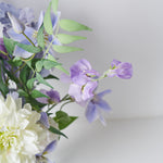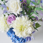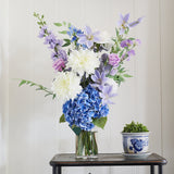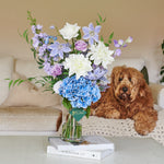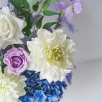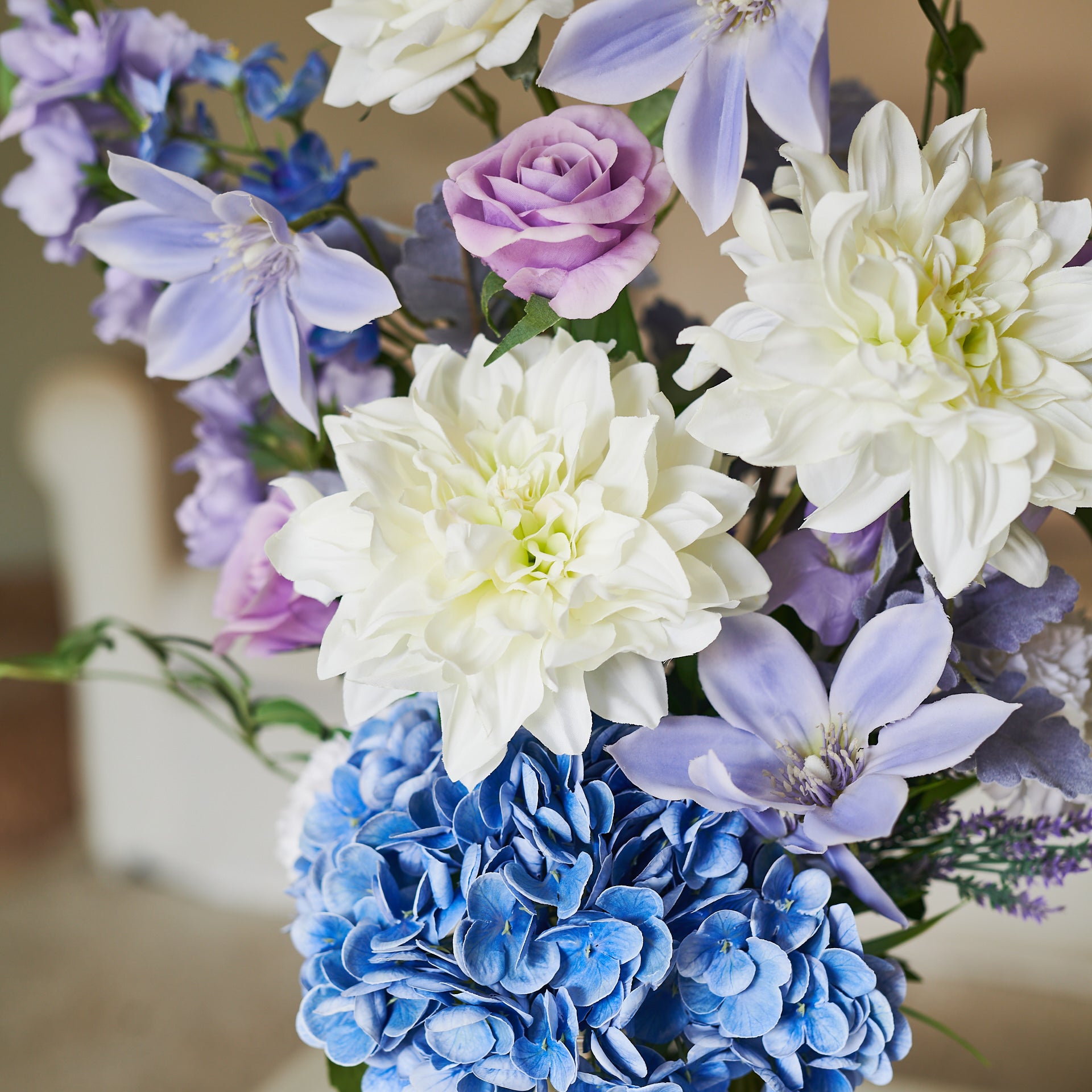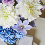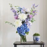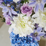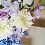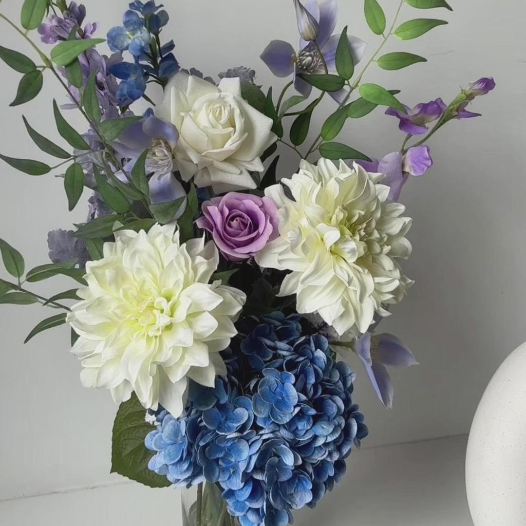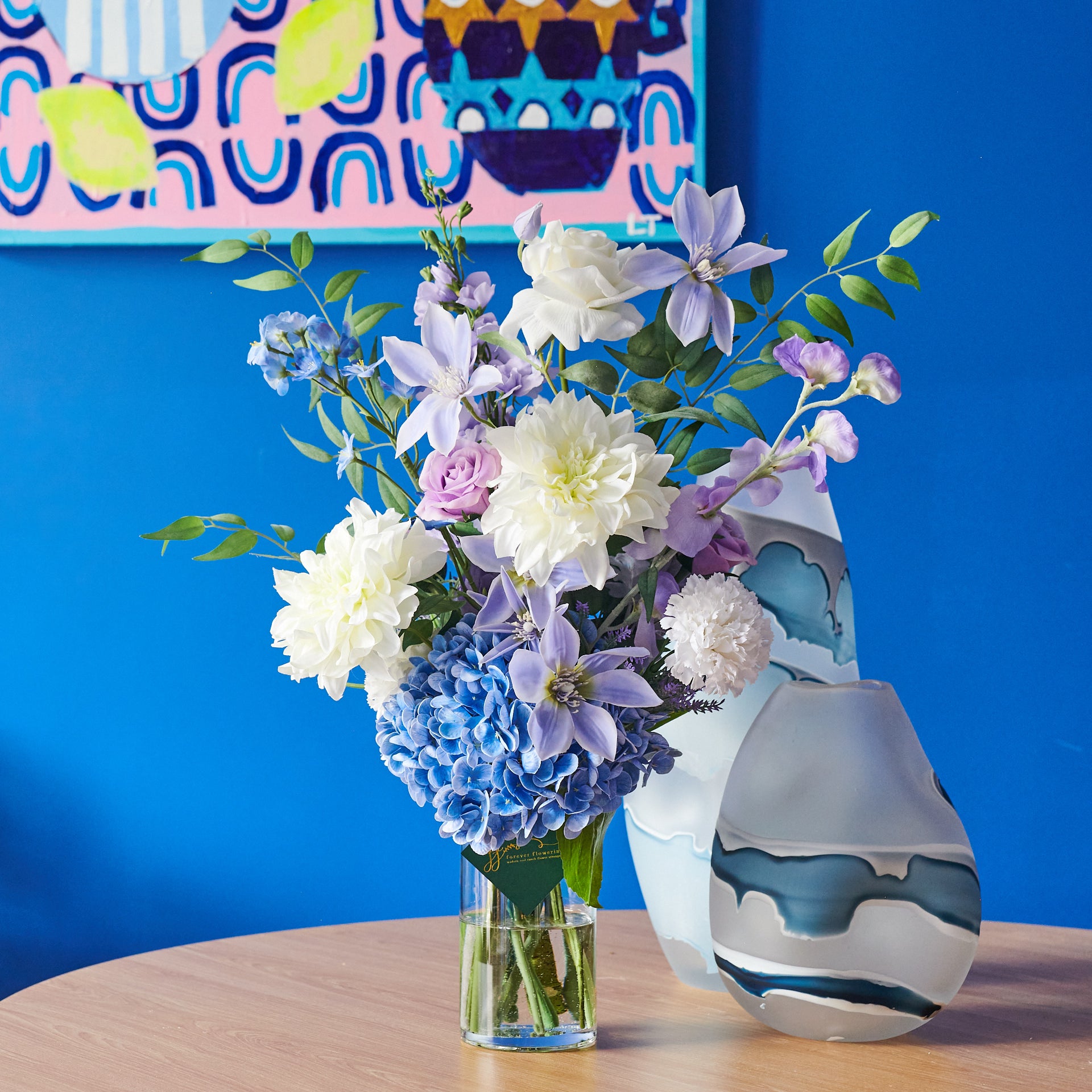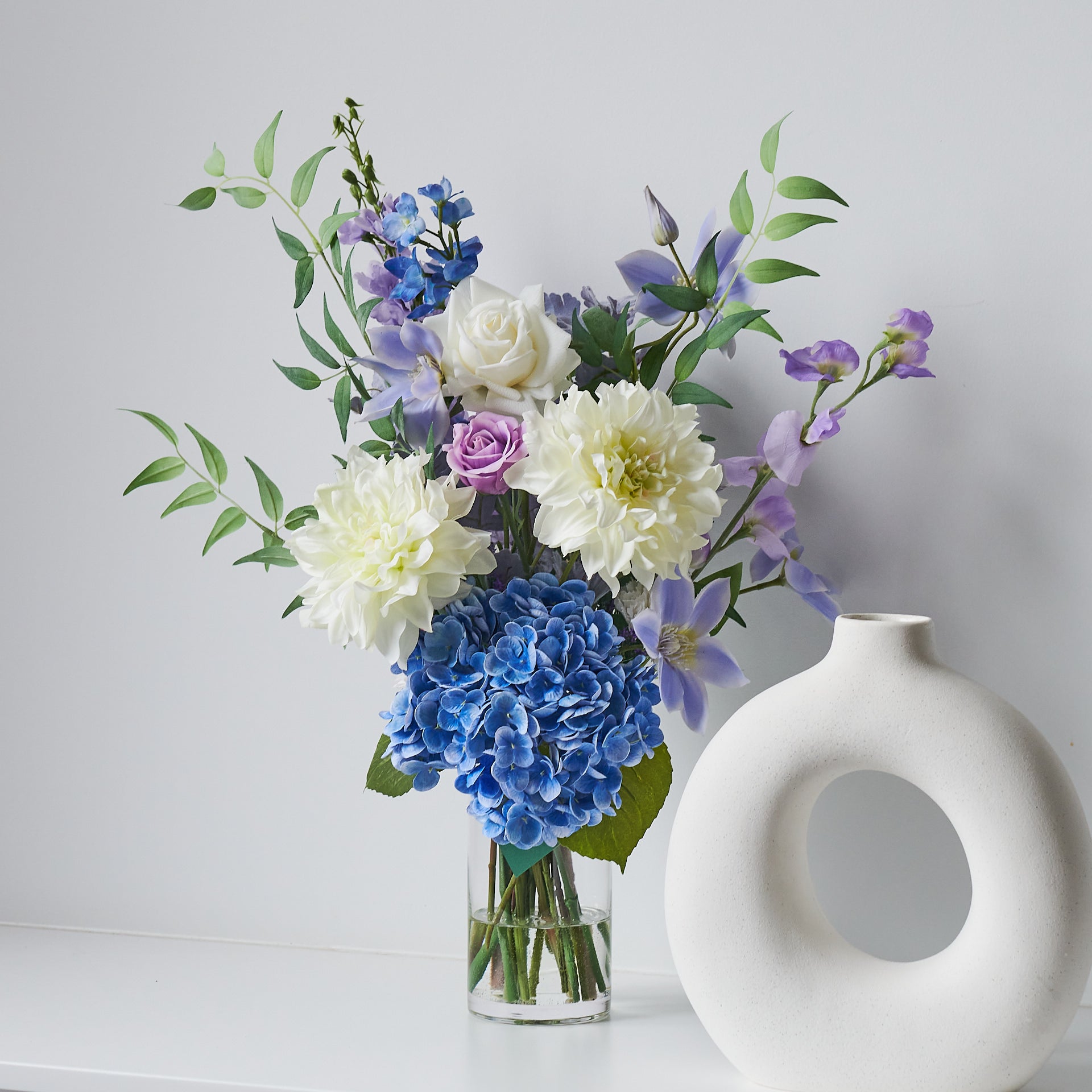 A soft tonal arrangement featuring Real Touch Hydrangea, Dahlia, Clematis and Carnations with Ruscus Leaf, Lavender, Sweet Pea and Dusty Miller, set in a Cylinder Glass Vase and Artificial Water.