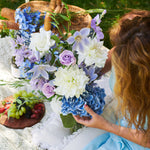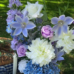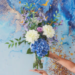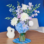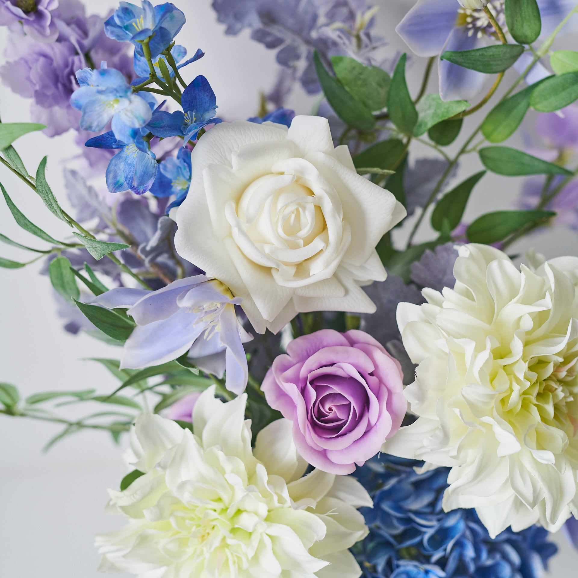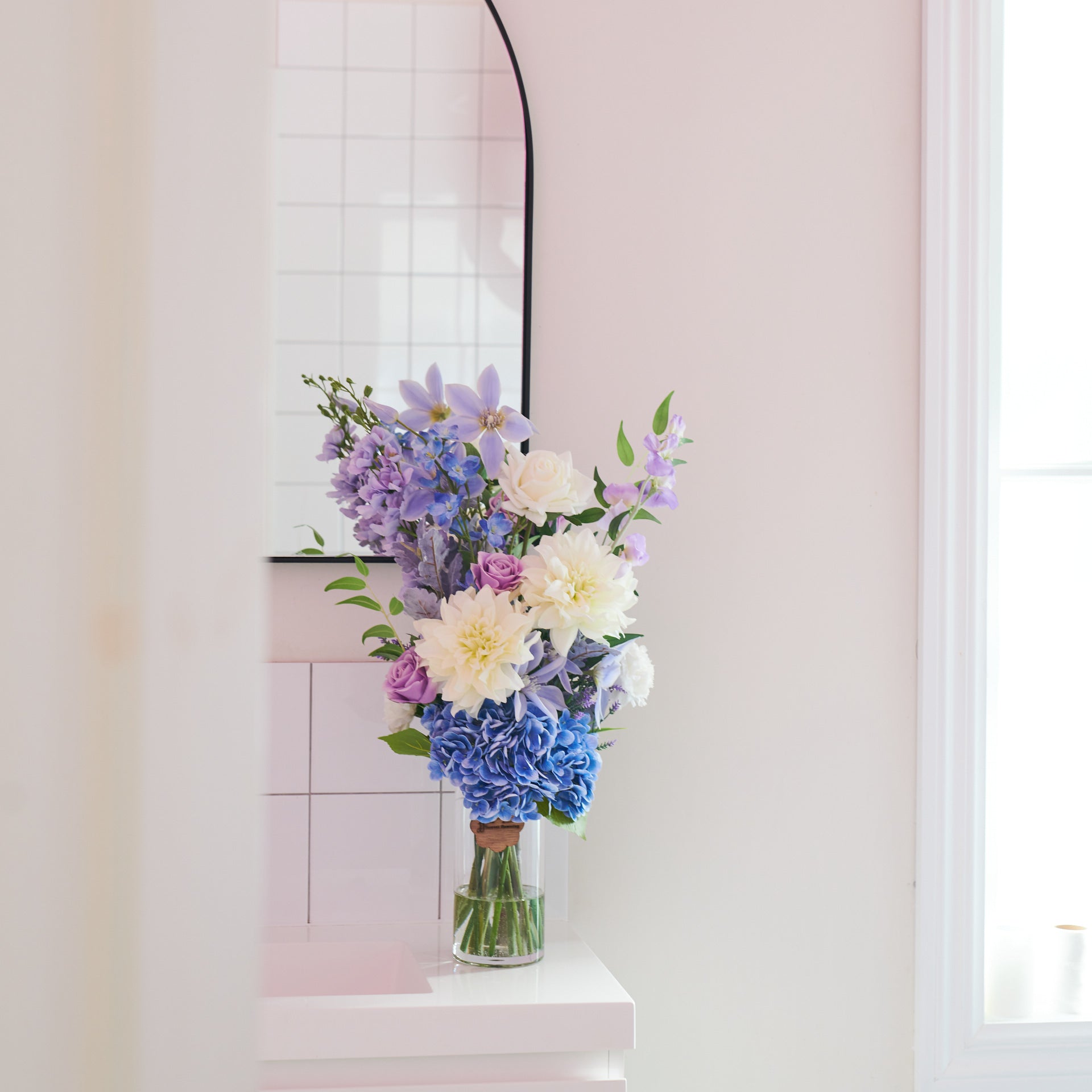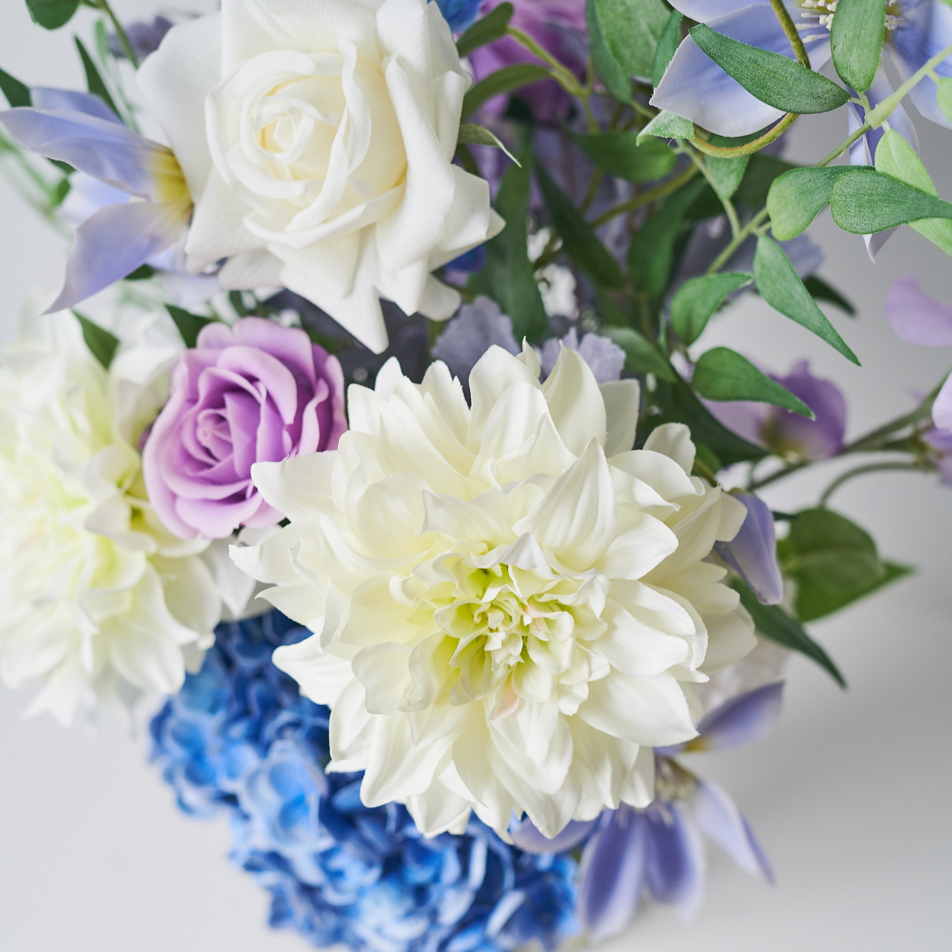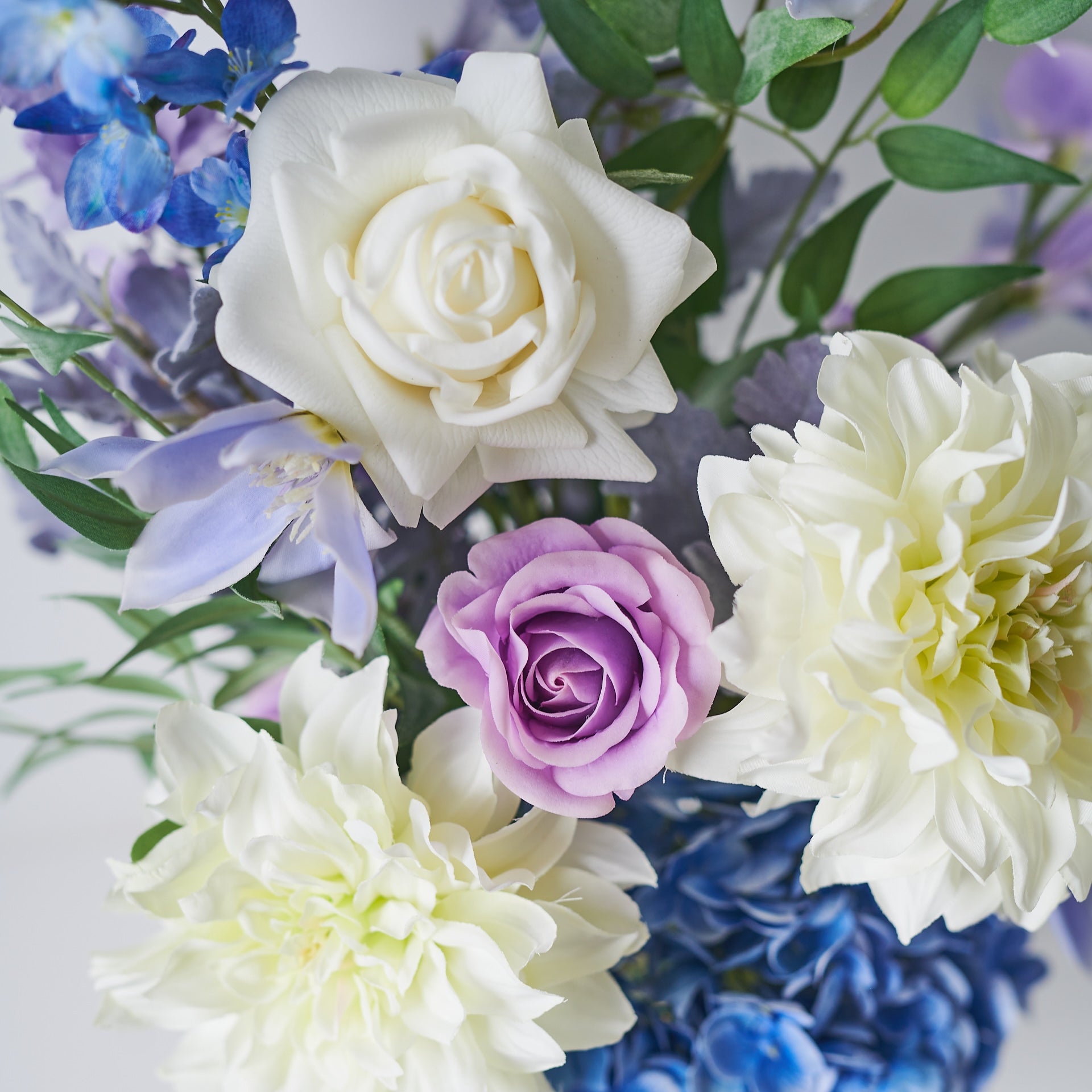 A soft tonal arrangement featuring Real Touch Hydrangea, Dahlia, Clematis and Carnations with Ruscus Leaf, Lavender, Sweet Pea and Dusty Miller, set in a Cylinder Glass Vase and Artificial Water.