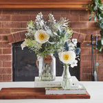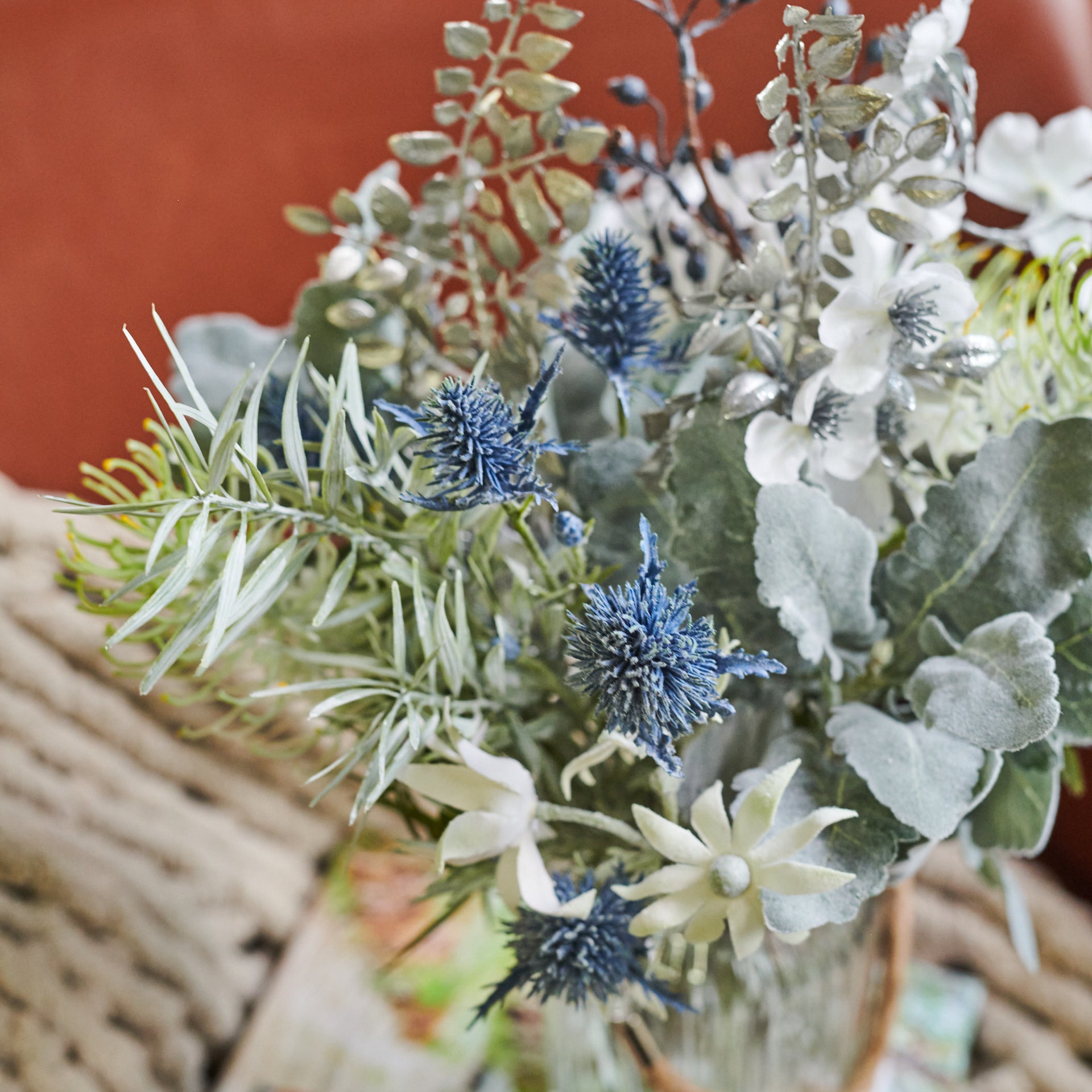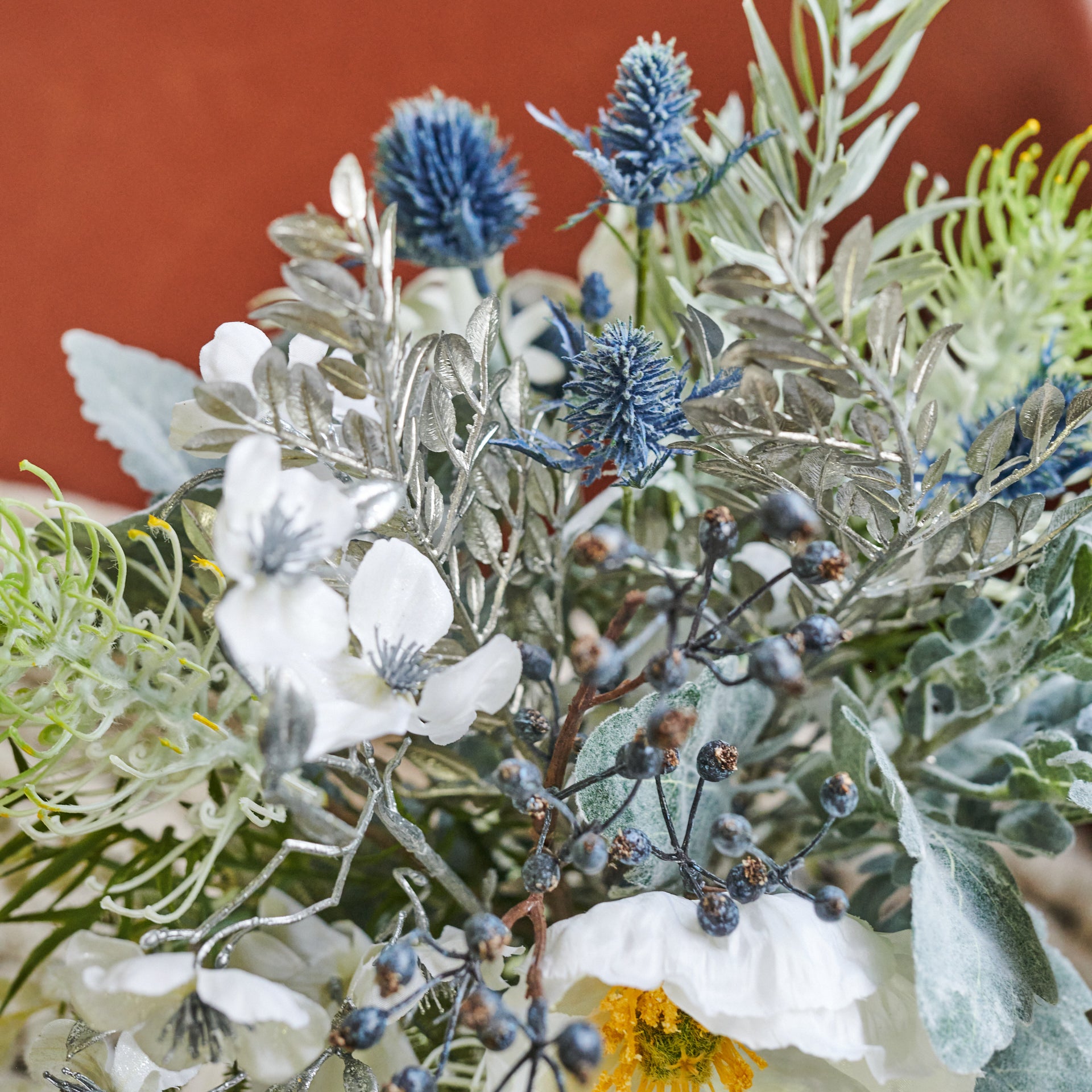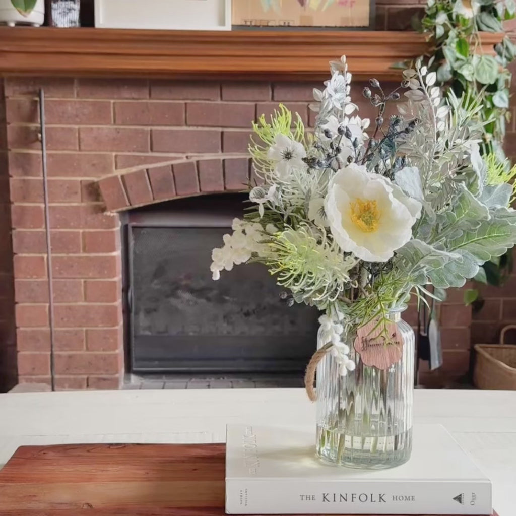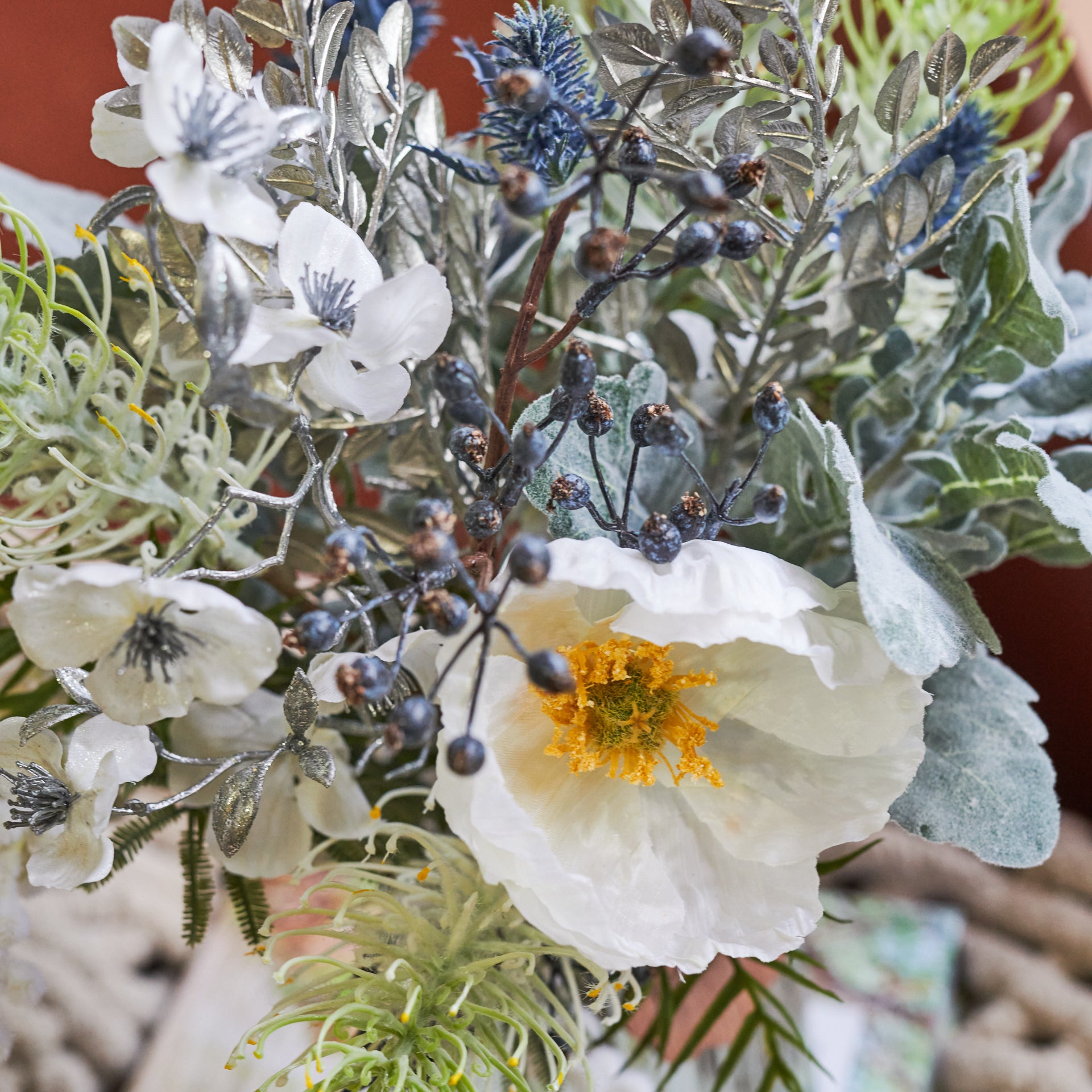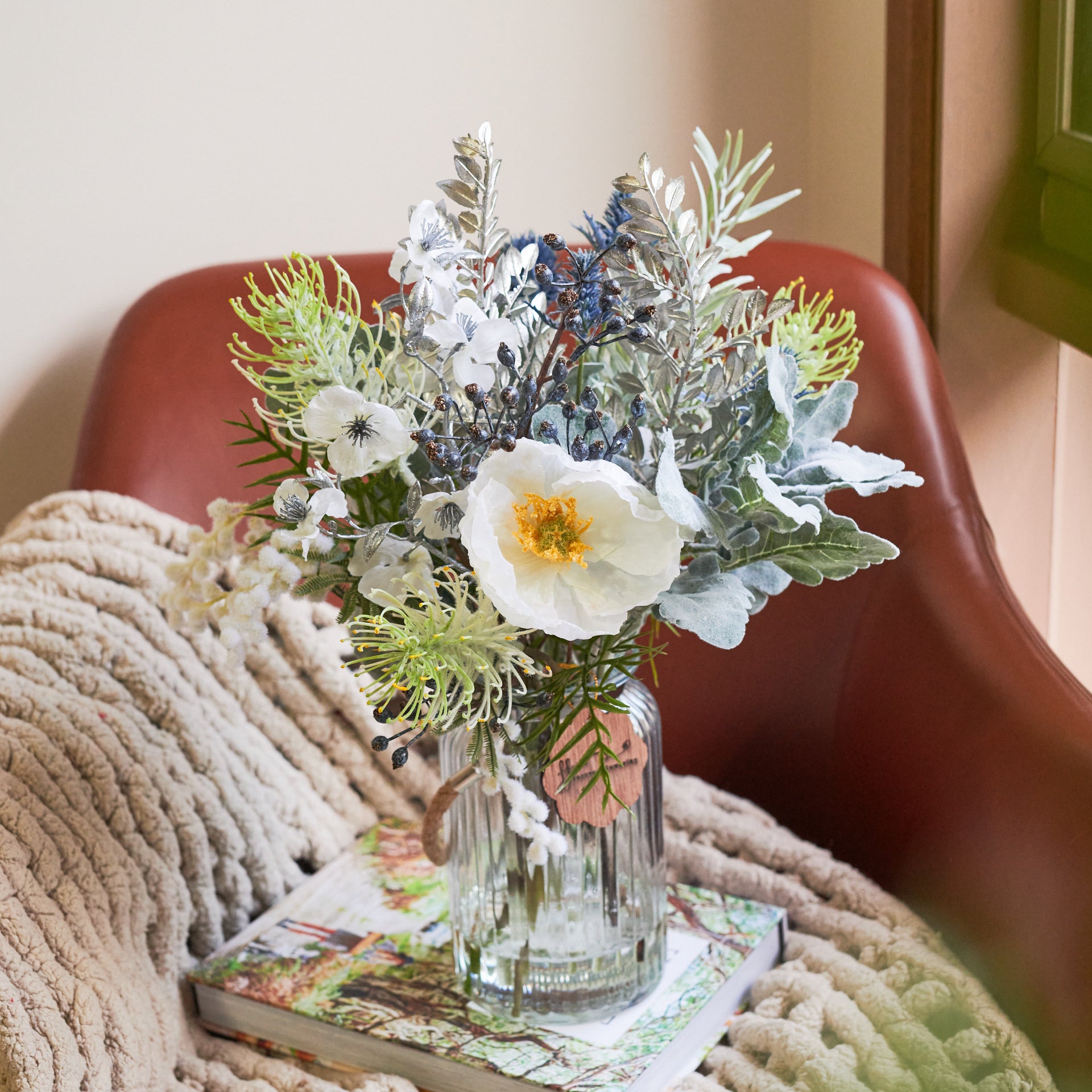 Snow: Real Touch Poppy, Dusty Miller and Thistle with Rosehip, Grevillea and Silver Accents set in Glass Vase in Artificial Water.